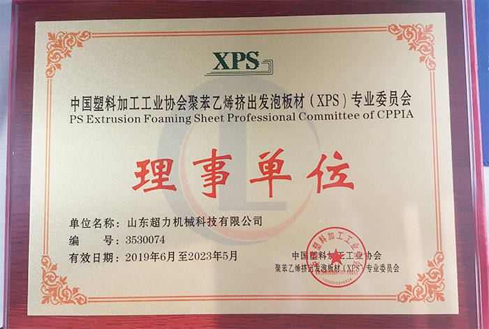 山東超力機(jī)械有限公司,憑借過(guò)硬的二氧化碳擠塑板(CO2-XPS)研發(fā)、生產(chǎn)技術(shù)與優(yōu)異的擠塑板設(shè)備質(zhì)量,被中國(guó)塑料加工工業(yè)協(xié)會(huì)聚苯乙烯擠出發(fā)泡板材(XPS)專業(yè)委員會(huì)授予協(xié)會(huì)理事單位。